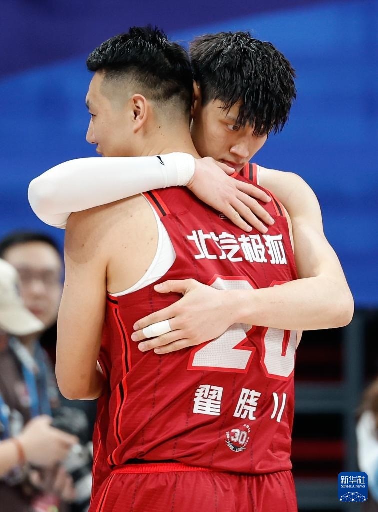3月5日,北京北汽队球员曾凡博在比赛后与队友翟晓川(前)拥抱。