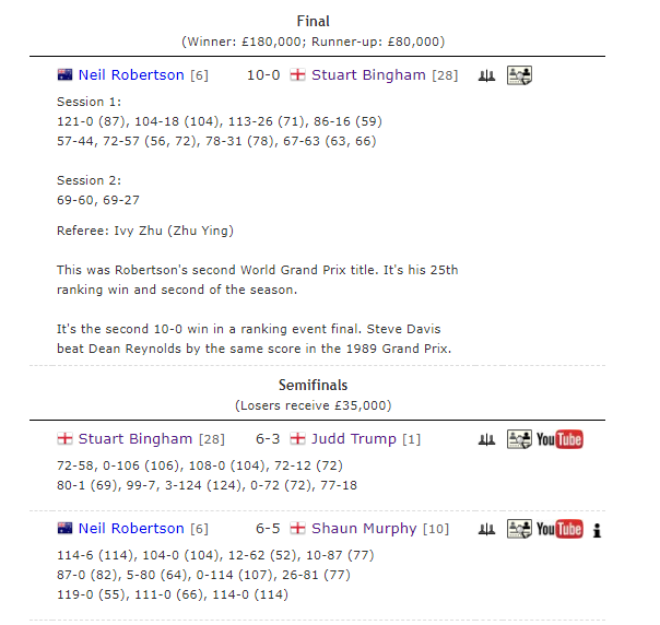第一轮,丁俊晖在3-2拿到赛点的情况下连丢三局,总比分3-4被选手逆转,他的赛事奖金为32强的9万。丁俊晖被淘汰,肖国栋、吴宜泽、徐念念、雷佩凡等4名中国选手打进16强。